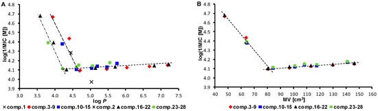 | Compd. | R1 | R2 | log P a | MVR2 a [cm3] | σ*R2 a | MIC [µM] | LD50 [µM] | ||||