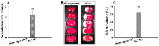 Neurobehavioral disability and infarct regions caused by middle cerebral artery occlusion I/R injury (MCAO), evaluated by neurobehavioral scores and 2,3,5-triphenyltetrazolium chloride (TTC) staining. (A) Neurobehavioral scores; (B) TTC staining of brain; and (C) infarct volume (%). Rats exposed to 1 h ischemia followed by 24 h reperfusion to establish MCAO model. Neurobehavioral disability of rats was assessed (n = 12), and brain tissues were collected for TTC staining (n = 6). Data are mean ± standard deviation (SD), ##: p < 0.01 for MCAO vs. sham-operated group.