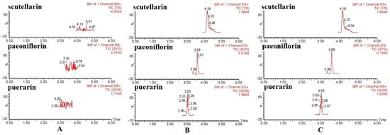 No interference was observed in the retention times of scutellarin, paeoniflorin, and puerarin (IS) in all plasma samples analyzed, and the method exhibited good specificity. Typical SIR chromatograms are shown in Figure 3.