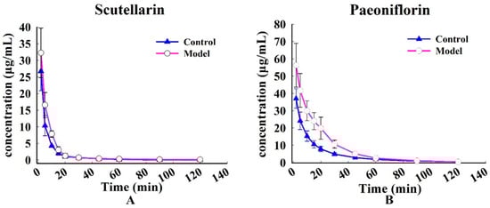 After intravenous administration of Xin-Shao formula extracts, mean residence time (MRT(0–t)) (0.42 ± 0.15 min) and terminal elimination half-life (t1/2z) (1.66 ± 0.68 min, p < 0.05) for scutellarin in the MCAO group were significantly prolonged relative to that of the sham-operated group (0.26 ± 0.09 min and 0.81 ± 0.48 min). Furthermore, area under the plasma drug concentration-time curve from 0 h to the terminal time point (AUC(0–t)) (18.35 ± 3.71 mg·min·L−1) and maximum plasma drug concentration (Cmax) (56.28 ± 12.62 mg·L−1, p < 0.01) for paeoniflorin in the MCAO rats were significantly higher than those of the sham-operated rats (10.35 ± 2.41 mg·min·L−1 and 36.40 ± 5.71 mg·L−1); on the contrary, decrease in apparent volume of distribution (Vz) of paeoniflorin was observed in MCAO rats (0.21 ± 0.08 L·kg−1), compared with those in sham-operated animals (0.43 ± 0.07 L·kg−1, p < 0.01). However, the disappearance of scutellarin and paeoniflorin plasma was slower in MCAO rats than in sham-operated rats. Lower values of clearance (CLz) (0.97 ± 0.26 vs. 1.57 ± 0.60 L·min·kg−1, p < 0.05) for scutellarin and (0.45 ± 0.11 vs. 0.78 ± 0.16 L·min·kg−1, p < 0.01) for paeoniflorin were observed in MCAO rats than those in sham-operated rats.