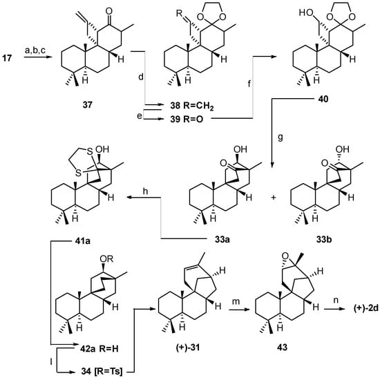 The starting material was the photoadduct 17 [47] (vide supra). Methylation at C(13) of the latter gave 37 which was acetalized to 38 by standard methods (Scheme 6). The exocyclic methylene in 38 was then cleaved to the cyclobutanone 39 and the latter reduced to the cyclobutanol 40 which on refluxing in a THF/HCl mixture underwent deacetalization followed by a retro-aldol and an aldol reaction to give 33 as an epimeric mixture at C(12) (see Section 8.1). The major epimer 33a was then converted into the corresponding dithioacetal derivative 41a and the latter desulphurized with Raney-Ni in EtOH to give 42a. The alcohol 42a was then transformed into the corresponding tosylate 34 which on heating in DMSO in the presence of the methyl sulfinyl carbanion gave (+)-stemod-12-ene (31) (see Section 8.3). (+)-2-Deoxystemodinone (2d) was eventually obtained from (+)-31 by epoxidation followed by hydride epoxide reduction [50]. The use of (+)-podocarpic acid (4) as starting material also allowed confirmation of the absolute configuration attributed to the stemodane diterpenoids on the basis of ORD and CD studies.
