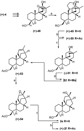 The aim of this work was to confirm the structure of (+)-19-acetoxystemodan-12-ol (2f) isolated in 1991 from Stemodia chilensis [52]. The structure of this diterpenoid had been established only on the basis of 1H- and 13C-NMR spectroscopic data and on their similarity with those of co-occurring (+)-2-deoxystemodinone (2d). The starting material was compound (+)-48, obtained from (+)-podocarpic acid (4) as previously described (see Section 7). The strategy adopted is that described in Scheme 5. The HO-C(12) in (+)-48 is properly oriented for rearrangement to the stemodane system. Nevertheless, prior to rearrangement it was necessary to remove the C(15) carbonyl group, which would have prevented the rearrangement to the stemodane system by inhibiting the formation of a positive charge on the adjacent bridgehead carbon, and to convert the HO-C(12) into a better leaving group after selective protection of the HO-C(19).