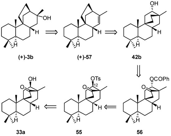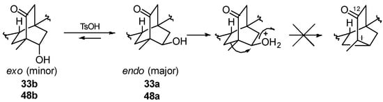 The remarkable feature of this approach is that, owing to the stereospecificity of the rearrangement and to the 1-methyl-6-hydroxybicyclo[2.2.2]octan-2-ones endo/exo equilibrium, the whole endo/exo mixture 33 is converted into the rearrangement product in which the C(13)-C(14) double bond is also present, a characteristic feature of some stemarane diterpenoids such as (+)-oryzalexin S (65) (Figure 4) [63,64] (induced in rice leaves in response to the invasion of the fungus Pyricularia oryzae or when exposed to UV radiation or heavy metals [65]) and a necessary tool for the introduction of the α-configured HO-C(13) if necessary.