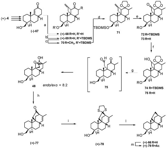 Finally, having in hand an efficient methodology for the construction of the C/D ring system of stemarane diterpenoids, we decided to apply it to the synthesis of (+)-2-deoxyoryzalexin S (66), the structure and absolute configuration of which had been established only on the basis of the corresponding 1H- and 13C-NMR spectra [66,67,68]. The strategy adopted is that described in Scheme 13. The starting material was (−)-19-hydroxypodocarp-9-en-12-one (67), available in four steps from (+)-podocarpic acid (4). Photoaddition of allene to (−)-67 in THF at −78 °C gave quantitatively the photoadduct (+)-68 the structure of which was established by 2D NMR experiments (Scheme 15). Prior to methylation at C(13), the HO-C(19) in (+)-68 was protected to give (+)-69. Compound (+)-69 was then methylated to give 70. The latter was then converted into the acetal 71, and the exocyclic methylene cleaved with OsO4/NaIO4 to give the cyclobutanone 72 along with some unprotected keto-alcohol 73. Compound 72 was then reduced to the cyclobutanol 74. Treatment of 74 with a 2:1 THF/2N HCl mixture gave 48 as an about 80:20 endo/exo C(12) epimeric mixture (see Section 8.1). The latter dissolved in toluene was heated at 85 °C in the presence of TsOH, giving (+)-77 (see Section 8.6). Thioacetalization of (+)-77 by standard methods followed by deoxygenation gave then (+)-2-deoxyoryzalexin S (66) which was then acetylated to (+)-79 [69].