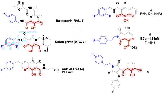As a result there has been a surge of research driving force to address these limitations with significant contributions from both academia and industry [2,9,10]. The current studies have been focused on the identification of new chemical classes that are able to retain the intrinsic potency and structural elements of the bidentate metal-binding pharmacophore (red color) which is essential for strand transfer inhibition and the halo-substituted phenyl rings (blue color) which interact with the penultimate cytosine base near the 3’-end of the viral DNA to prevent the insertion of the viral DNA into the host genome [11,12]. These efforts provide several distinct structural classes. Some second-generation drug targeting IN, such as dolutegravir (DTG, 2) [13], which has been approved for clinical use, and GSK364735 (3) [14,15] is in phase II clinical trials (Figure 1). Although they display superior characteristics to RAL and EVG, the cross-resistance has still been observed and the subsequent secondary mutations diminish the inhibitory activity [16,17,18]. Therefore, intensified search for IN inhibitors with novel chemical features to overcome the resistance and more investigation of the structure-activity relationship are urgently needed.