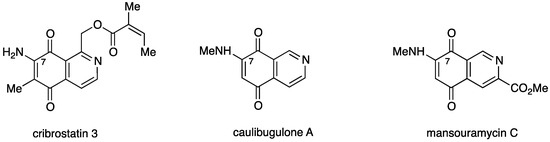 Among the broad variety of N-heterocyclic quinones with anti-cancer activity are the naturally occurring 7-aminoisoquinolinequinones such as cribrostatin 3 [7], caulibugulone A [8], and mansouramycin C [9] (Figure 1).