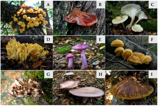 Frutifications of the wild studied mushrooms. (A) Cyttaria hariotii; (B) Fistulina antarctica; (C) Hydropus dusenii; (D) Ramaria patagonica; (E) Cortinarius magellanicus; (F) Aleurodiscus vitellinus; (G) Grifola gargal; (H) Lepista nuda; (I) Fistulina endoxantha.