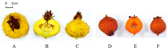 Morphology of R. roxburghii (A–C) and R. sterilis (D–F) fruits.