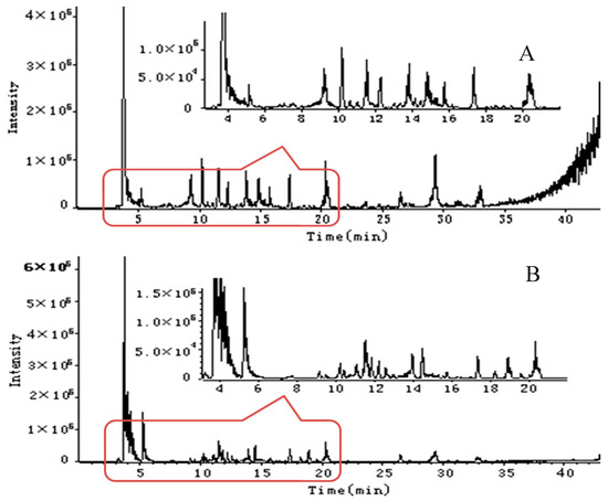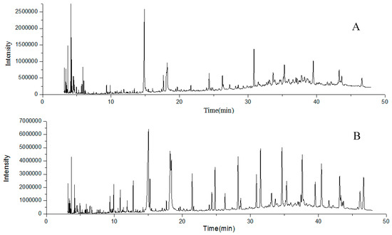 The representative total ion chromatograms of R. roxburghii (A) and R. sterilis (B) fruits obtained from GC-MS analysis.
