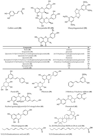 Condensed tannins: In the MS spectra, four condensed tannins were identified on the basis of a fragmentation pattern with successive loss of 288 Da corresponding to the loss of catechin units (C15H12O6) [37]. According to previous reports [35,36], they were tentatively identified as procyanidin B1 (21), procyanidin B2 (24), fisetinidol-(4α,8)-catechin (27) and procyanidin B3 (29) with the depronated ions at m/z 305.06686, m/z 577.13504, m/z 577.13567, m/z 561.14044 and m/z 577.13543, respectively.