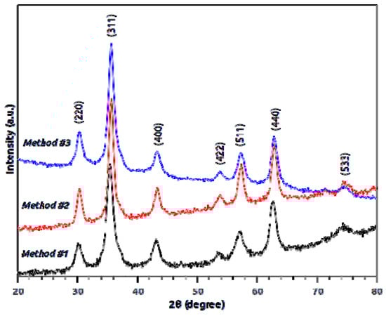 X-ray diffractograms of magnetite nanoparticles synthesized by the three methods. The labeled crystallographic planes refer to magnetite.