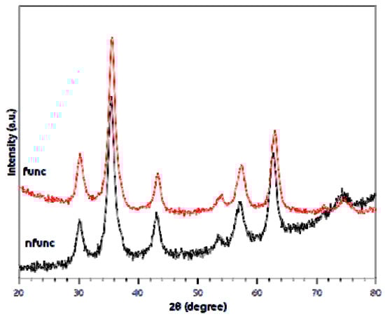 X-ray diffractograms of nonfunctionalized (nfunc) and functionalized with oleic acid (funct) magnetite nanoparticles, synthesized using Method #1.