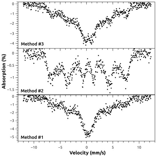 Room temperature 57Fe Mössbauer spectra of the nonfunctionalized iron oxide nanoparticles synthesized by the tree different methods. The spectra were taken with different acquisition times.