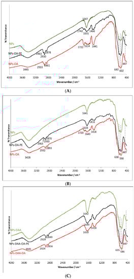 FTIR spectra of as obtained and functionalized magnetite NPs by: (A) Method #1; (B) Method $2; and (C) Method $3. OA—oleic acid, PE—propolis extract, DAA—dehydroascorbic acid.