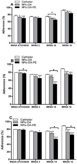 Functionalized Fe3O4/C18 nanoparticles without propolis extract present ability for inhibiting the adherence of MRSA strains, as already reported by Anghel et al. [15], nevertheless always inferior when compared to those samples also functionalized with propolis extract, which reveals the importance of this extract on the activity.