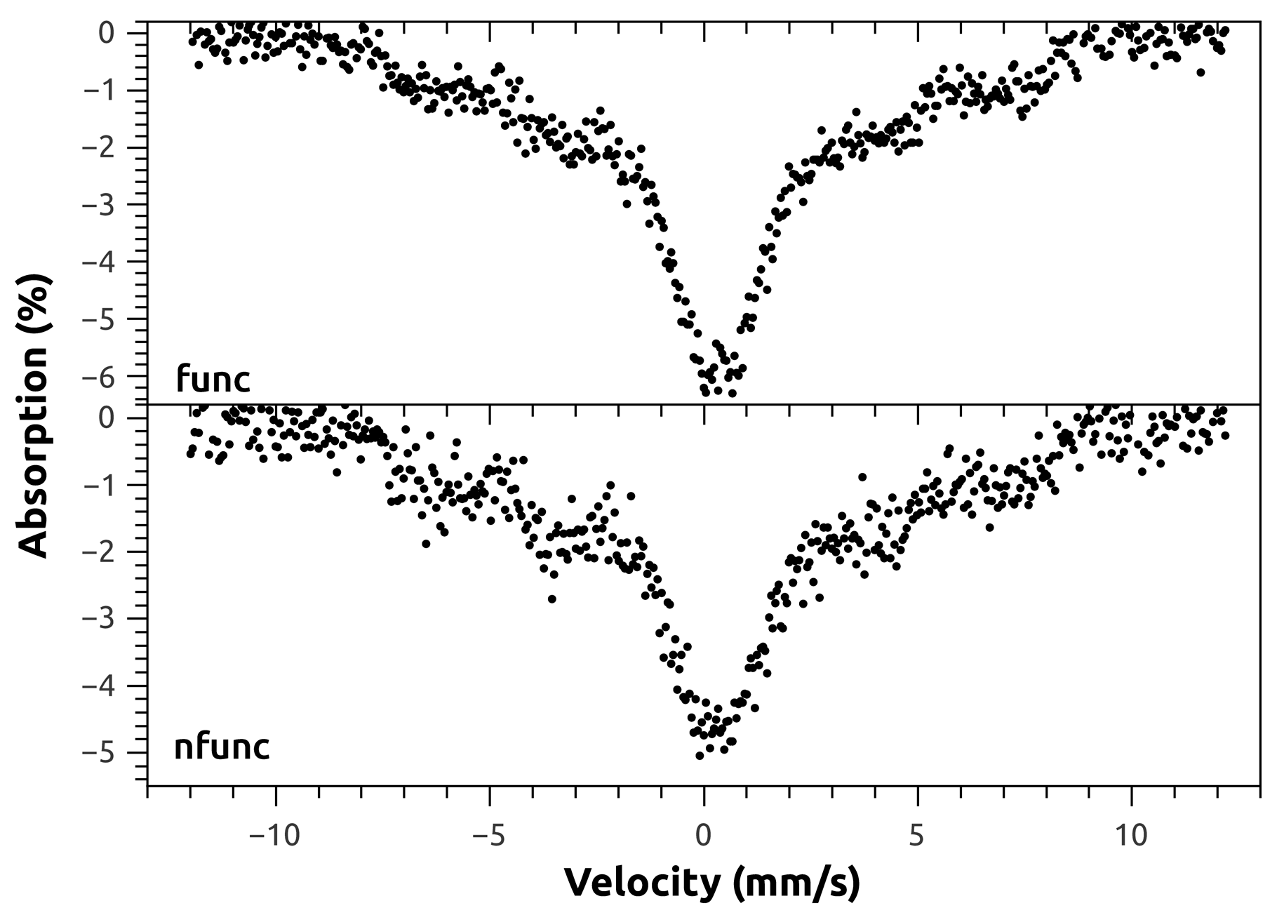 Room temperature 57Fe Mössbauer spectra of magnetite nanoparticles, nonfunctionalized and functionalized with oleic acid, synthesized by Method #1. The acquisition time is different for the two spectra.