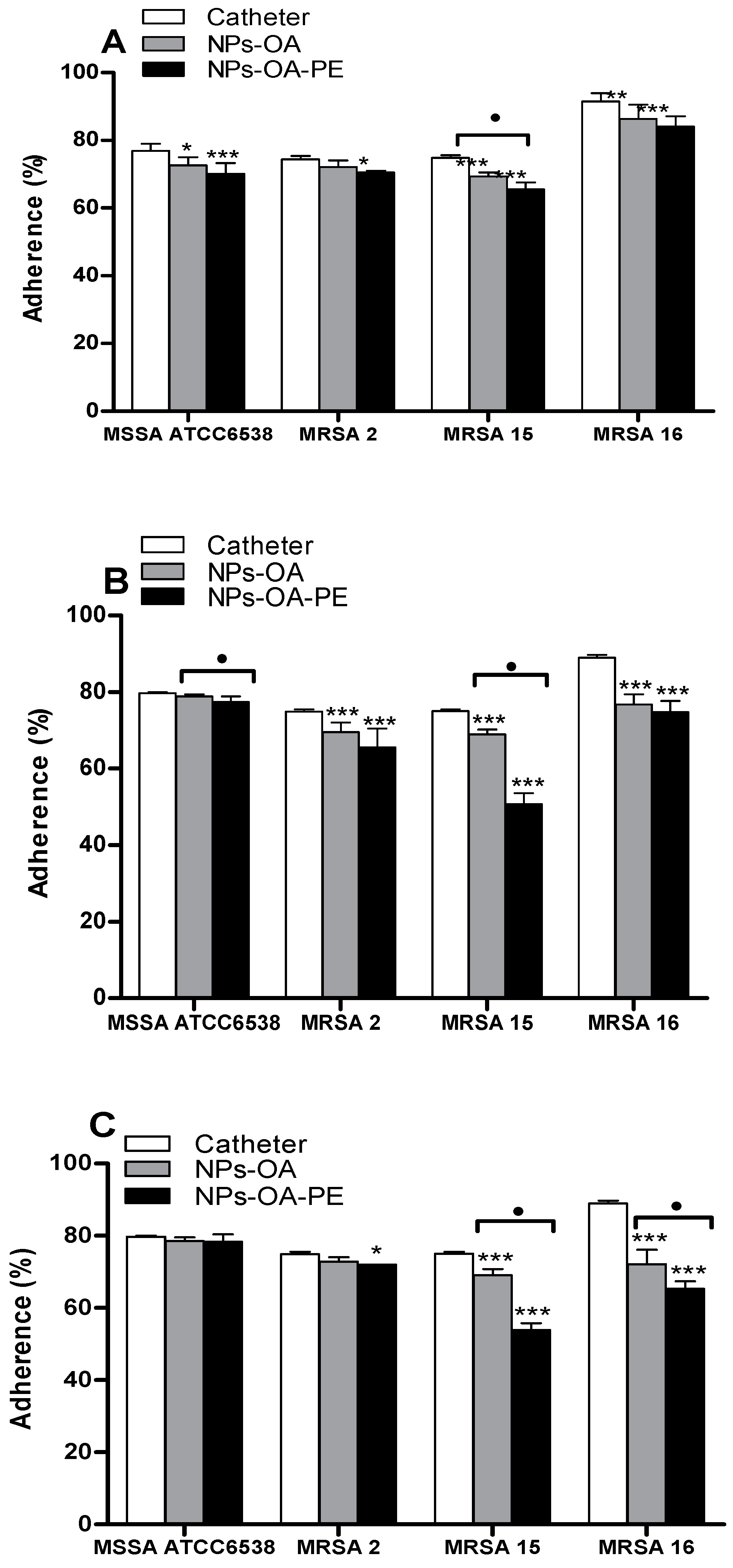 Percentage of adherence of microorganisms on catheter after contact with functionalized MNPs obtained by different methods: (A) Method #1; (B) Method #2; and (C) Method $3. OA—oleic acid, PE—propolis extract, Data represent the mean ± S.D from two separated experiments, * p < 0.05; ** p < 0.01; *** p < 0.001 (n = 6), statistically significant when compared with catheter not submitted to any treatment. Square brackets indicate the use of One Way ANOVA for each group. ● p < 0.05 (n = 6).