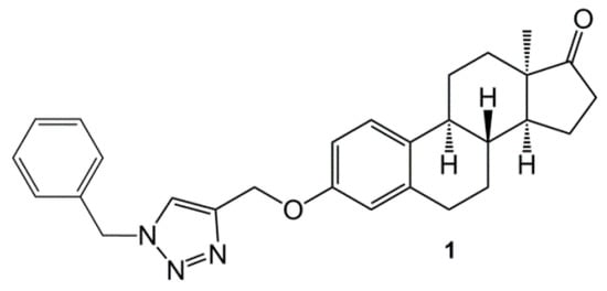 Estrogens are synthesized biochemically in a multistep process from cholesterol in human body [1], and are responsible for the development of secondary sexual characteristics in females and maintenance of central nervous system, cardiovascular system and bones. Since they play a crucial role in the cell proliferation, overproduction of estrogens may lead to enhanced proliferation of hormone sensitive cells, resulting in hormone dependent cancers: ovarian, uterine, breast, prostate and endometrial [2]. Estrone-based anticancer drugs have been developed as antiproliferative/antihormonal or cytotoxic agents acting on non-hormonal targets [3]. Antiproliferative estrogens exert their activity as enzyme inhibitors or as antiestrogens (acting through their receptors). Although the proliferation process is rather complex, one of potential enzymes which plays crucial role in the proliferation process of some cancer cell types is the human 17β-hydroxysteroid dehydrogenase 1 (17β-HSD1). It catalyzes the reduction of estrone to 17β-estradiol, which enhances the proliferation of certain cancer cells [4]. High activity of this isozyme can be detected in female reproductive tissues, e.g., in the ovaries and in the placenta [5]. 17β-HSD1 has been found to be responsible for the local overproduction of 17β-estradiol in various breast cancers and ovarian cancers [6]. The inhibition of 17β-HSD1 with suitable pharmacons decreases synthesis of 17β-estradiol and causes significant estrogen deprivation and antitumor effect in hormone dependent cancers, therefore 17β-HSD1 inhibitors could be promising candidates of anti-estrogen therapy [7,8]. Regardless of the mechanism of antiproliferative action, there is a general requirement in the development of all estrone-based anticancer drugs: the lack of estrogenic activity. Chemical modifications of estrone may lead to compounds lacking hormonal behavior [3,9,10]. Substitution at C-2, opening of ring D or inversion at C-13 of the estrane skeleton usually leads to the loss of estrogenic activity [11,12,13,14,15,16]. 13α-Estrone may be an excellent scaffold for the design of hormonally inactive agents having antiproliferative activity and fortunately it is readily available from native 13β-estrone by the method of Yaremenko and Khvat, using 1,2-phenylenediamine and acetic acid [17]. We recently published 13α-estrone, 1,2,3-triazolyl 13α- and d-secoestrone derivatives possessing substantial cytostatic and/or 17β-HSD1 inhibitory properties [18,19,20,21,22]. 13α-Estrone itself exerted outstanding 17β-HSD1 inhibitory activity with an IC50 value comparable to that of the reference estrone [22]. Concerning the triazoles, the heterocyclic ring was introduced to C-3 or to C-16 directly or via a short linker. The cell growth-inhibitory potential depended on the position of the triazolyl moiety and on the nature of the functional group at C-3. 3-Hydroxy or 3-ether derivatives displayed lower cytostatic potentials than their 3-O-[(1-benzyl-1H-1,2,3-triazol-4-yl)methyl] counterparts. The latter triazoles displayed one order of magnitude higher activities (submicromolar IC50 values) than the earlier described potent 16-triazolyl 3-O-benzyl ethers [18]. It can be stated that concerning the antiproliferative behaviour of triazolyl 13α-estrones, functionalization at C-3 over C-16 seems more preferential. One of the most potent antiproliferative compounds was 3-O-[(1-benzyl-1H-1,2,3-triazol-4-yl)methyl]-13α-estrone bearing intact ring D (1, Figure 1). Based on its remarkable cytostatic potential (IC50 = 0.3–0.9 μM, [20], this 13α-estrone triazole conjugate (1) may be used as a model compound for further derivatization with dual aim: to improve its cell growth-inhibitory potential to nanomolar scale, and to enhance its tumor selectivity. A potential route to enhance this selectivity is to prepare bioconjugates. Our recent results suggest that the triazole ring at 3-O should remain to retain the biological activity, but the azide counterpart used in the CuAAC reaction may be another biomolecule, such as a nucleoside.