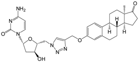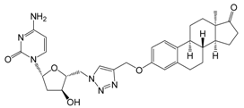 3-{[1-(2′,5′-Dideoxycytidine-5′-yl)-1H-1,2,3-triazole-4-yl]methyloxy}-13α-estra-1,3,5(10)-trien-17-one (13c): After purification, conjugate 13c was obtained as a white solid (45 mg, 81%), m.p. 170 °C (dec.), Rf = 0.41 (ss C); 1H-NMR (DMSO-d6); δ [ppm] = 0.96 (s, 3H, 18-CH3), 2.29 (m, 2H, 2′-H2), 2.74 (m, 2H, 6-H2), 3.75 (m, 1H), 4.21 (m, 2H), 4.62-4.72 (overlapping m, 2H): 1′-, 3′-, 4′-H, 5′-H2, 5.06 (s, 2H, OCH2), 6.70 (s, 1H, 4-H), 6.75 (d, 1H, J = 6.5 Hz, 2-H) 7.15 (d, 1H, J = 8.0 Hz, 1-H), 7.29 (s, 1H, HC=C), 8.04 (d, 1H, J = 6.5 Hz, 6”-H), 8.19 (s, 1H, 4”-NH2); 13C-NMR (DMSO-d6); δ [ppm] = 24.6 (C-18), 27.8, 28.1, 29.8, 31.7, 33.0, 36.1 (C-2′), 40.8 (2C, C-8 and C-9), 43.4, 48.6 (C-14), 50.5 (C-13), 51.5 (C-5′), 61.3 (OCH2), 84.1, 84.9, 87.3, 94.5 (C-5”), 112.5 (C-2), 114.2 (C-4), 125.2 (C-1), 126.8 (HC=C), 132.1 (C-10), 137.9 (C-5), 141.1 (C-6”), 142.9 (HC=C), 155.0 (C-3), 155.2 (C-2”), 165.6 (C-4”), 220.7 (C-17); ESI-MS: 561 [M + H]+; Anal. Calcd for C30H36N6O5: C, 64.27; H, 6.47; N, 14.99. Found: C, 64.42; H, 6.34; N, 15.18.