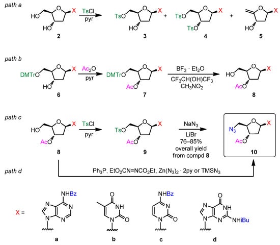 Alternatively, Mitsunobu reaction [50,51,52] with hydrogen azide, trimethylsilyl azide or zinc azide-pyridine complex [53] is also a possible alternative to prepare azides from nucleosides, provided that the senstive sugar moieties survive these conditions (Scheme 1, path d).