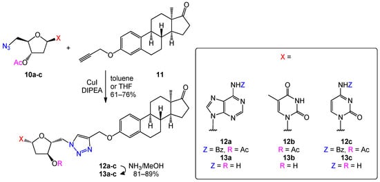 Azidonucleoside 10a, 10b or 10c (0.15 mmol) was dissolved in toluene (10 mL) or THF (10mL), CuI (0.225 mmol, 42.75 mg, 1.5 equiv.), DIPEA (78 μL, 0.45 mmol, 3 equiv.) and 3-O-propargyl-13α-estrone 11 [20] (0.165 mmol, 1.1 equiv.) were added to the reaction mixture and it was stirred for overnight at 50 °C. Then the mixture was evaporated in vacuo, the resulting crude product was purified by column chromatography with EtOAc as eluent to yield protected conjugate 12a, 12b or 12c.