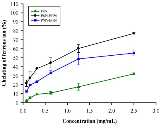 Each sample (PSPs, PSPs-EH20 and PSPs-EH80), at a different concentration (from 0 to 2.5 mg/mL) (2 mL), was vigorously mixed with 1.7 mL distilled water and 0.1 mL of 2 mM FeCl2. The reaction was initiated by adding 0.2 mL of 5mMferrozine, and the mixture was shaken vigorously and left standing at room temperature for 10 min. A control test was performed with distilled water but without a test sample; the solution without ferrozine added was used as a control. The ferrous ion chelating ability was determined by measuring the absorbance at 562 nm using a spectrophotometer (Hitachi U-3010, Tokyo, Japan). The ferrous ion chelating ability was calculated as follows [36]: