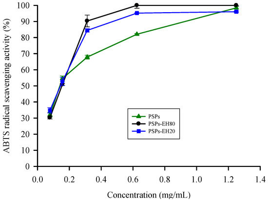 Antioxidant effects of PSPs and PSPs-EH on ABTS•+ radical scavenging activity. The color change was determined by measuring the absorbance at 735 nm. Error bars represent SD (n = 3), p < 0.05.