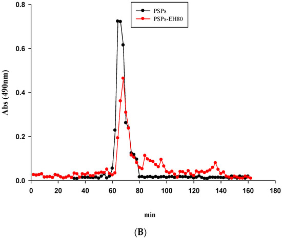 Gel filtration chromatography of the PSPs and PSPs-EH80 on Sepharose CL-6B. The Sepharose CL-6B was calibrated with different molecular masses of dextran (A). In this column, the PSPs and PSPs-EH80 elution profiles were determined using the phenol-sulfuric acid method (B).
