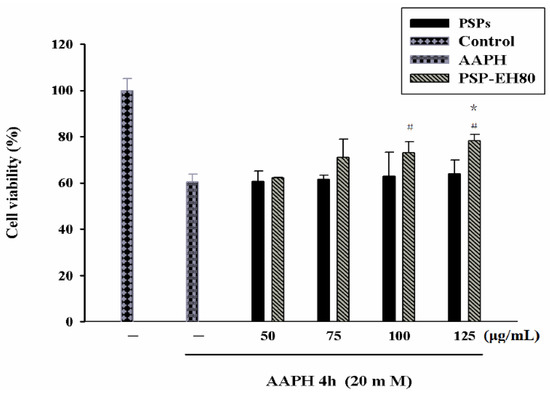 HaCaT cell survival rates after treatment with PSP, PSP-EH80 and AAPH. HaCaT cells (1 × 104) were pre-incubated for 24 h and the cells treated with varying concentrations (μg/mL) of PSPs and PSPs-EH80 for 24 h. AAPH (20 mM) was then added for 4 h at 37 °C in a 5% CO2 atmosphere. The absorbance was measured at 570 nm by ELISA. The results are represented as percentages of the control. * p < 0.05 compared with the PSPs group; # p < 0.05 compared with the AAPH group.