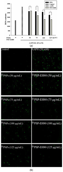 Our data suggest that the PSP-EH80 has a better protective effect than PSP on AAPH-induced cell death. Previous studies have reported that AAPH induces oxidative stress through the intracellular elevation of ROS in a variety of cells, including macrophages and keratinocytes [29,30,31]. Increased ROS can break the intracellular antioxidant defense system and cause cell damage and death [32]. In the present study, the oxidative stress induced by AAPH in HaCaT cells was determined by intracellular ROS generation using a DCFH-DA assay. As shown in Figure 7a,b, AAPH increased ROS generation by 2-fold in the HaCaT cells when compared with the control cells. PSP-EH80 treatment (50–125 μg/mL) significantly inhibited AAPH-induced ROS generation in a dose-dependent manner. Our results suggest that PSP-EH80 could prevent cell death induced by AAPH through inhibiting ROS generation. A previous study indicated that polysaccharides with low molecular weight showed better antioxidative ability [11]. Our results also found that the antioxidative effect of PSP-EH80 was better than that of PSPs.