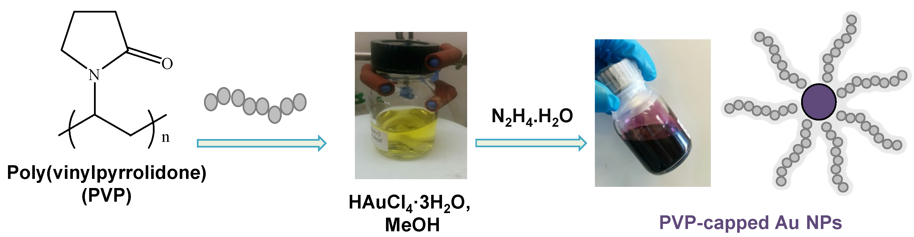 The PVP/Au nanohybrids were prepared in the form of highly stable colloidal solutions in methanol. The reaction process involved the reduction of the Au(III) ions into metallic Au(0) nanoparticles (NPs) upon introducing hydrazine monohydrate as a reducing agent (Figure 1).