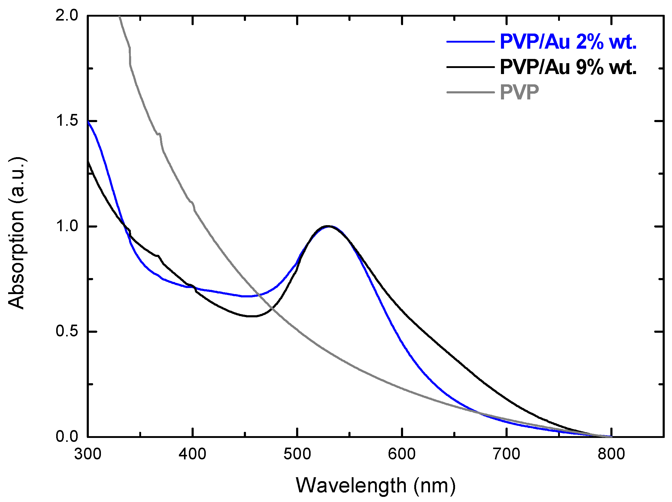 The optical characterization of the PVP and the PVP/Au methanol solutions was performed by UV-vis spectroscopy (Figure 2).