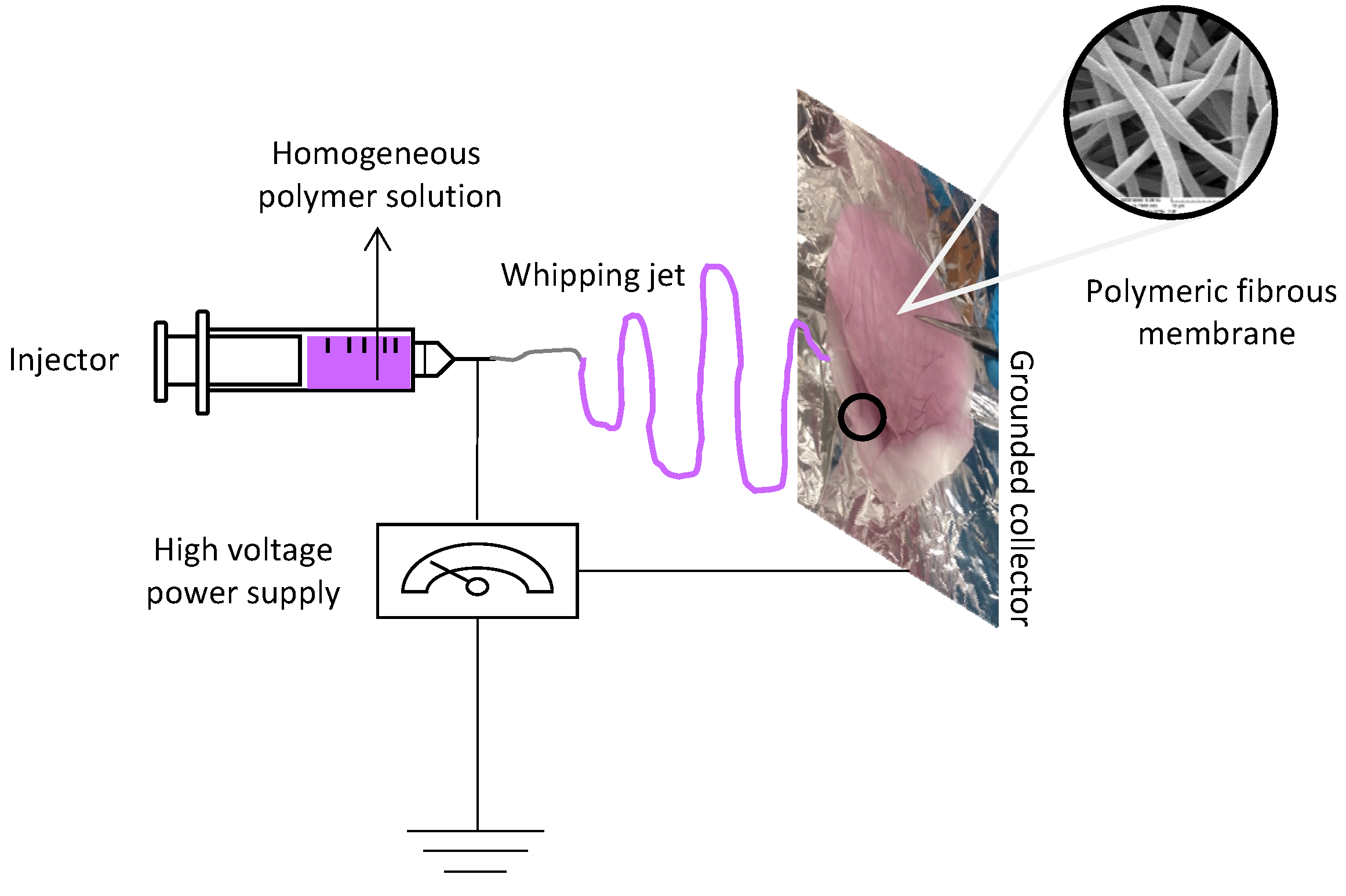 The PVP/Au colloidal nanohybrid solution was employed for the fabrication PVP/Au nanocomposite fibrous membranes by means of the electrospinning technique. All electrospinning experiments were performed at ca. 20 °C. Equipment included a controlled-flow, four-channel volumetric microdialysis pump (KD Scientific, Model: 789252), syringes with specially connected spinneret needle electrodes, a high-voltage power source (10–50 kV) and a custom-designed, grounded target collector, inside an interlocked Faraday enclosure safety cabinet. Systematic parametric studies were performed by varying the applied voltage, the needle-to-collector distance, the needle diameter and the flow rate so as to determine the optimum experimental conditions for obtaining bead-free fibrous materials.