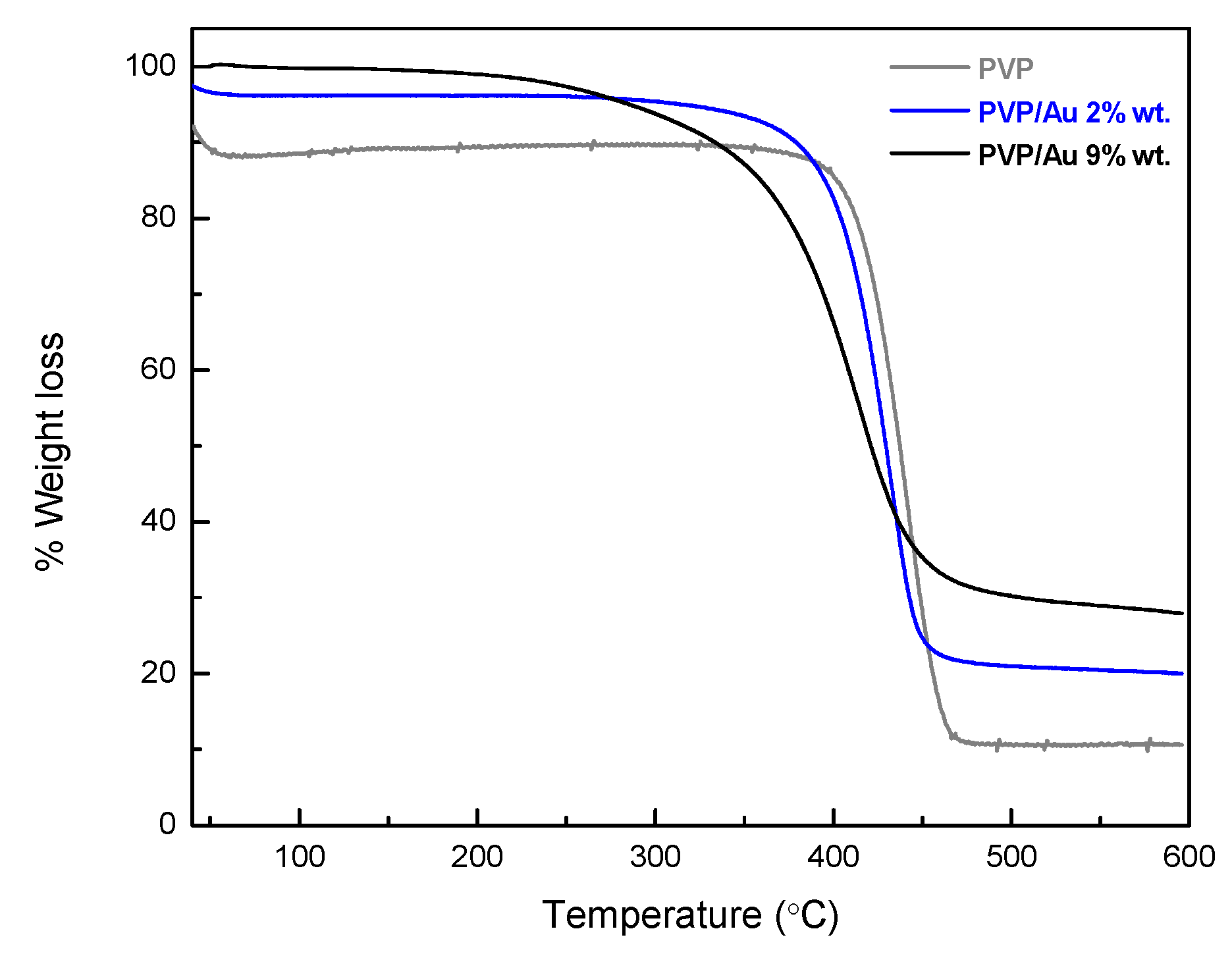 The thermal stability of the as-prepared PVP electrospun fibrous membranes was investigated in the presence and absence of Au NPs by means of thermal gravimetric analysis (TGA). Figure 4 provides the TGA thermograms of the pristine PVP membrane and the nanocomposite PVP/Au systems. As seen in Figure 4, PVP degraded at ~400 °C, in line with our previously reported findings [64]. However, residue formation owing to incomplete combustion at this temperature range was observed, even in the case of the pure PVP system, which prevented the accurate determination of the Au NP content in the PVP/Au systems.