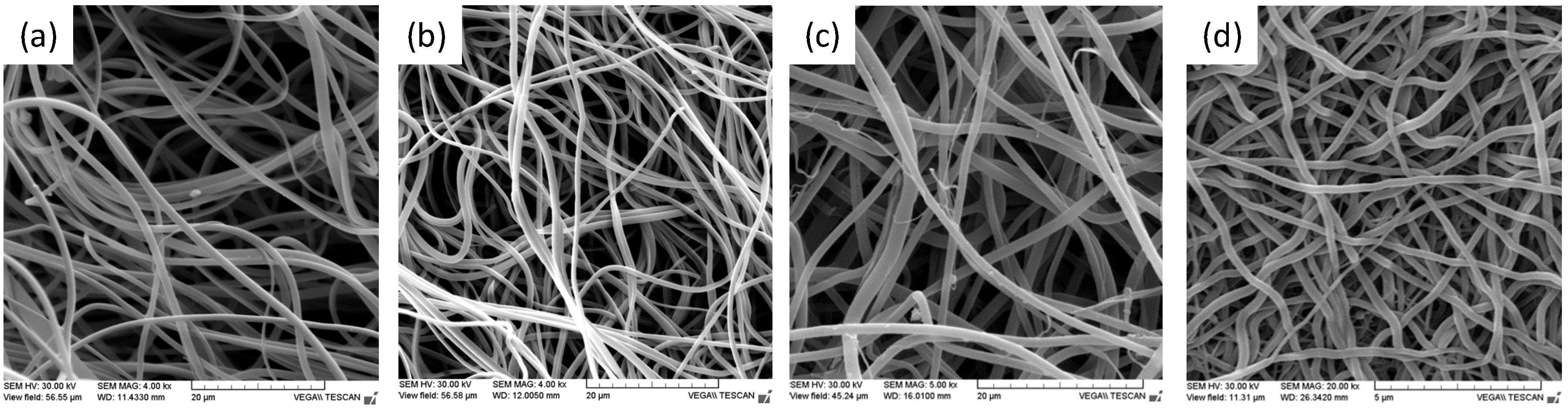 SEM images of the as-prepared pristine PVP (a) and of the PVP (b), PVP/Au, (2% wt) (c) PVP/Au, (9% wt) (d) electrospun fibrous mats obtained upon crosslinking.
