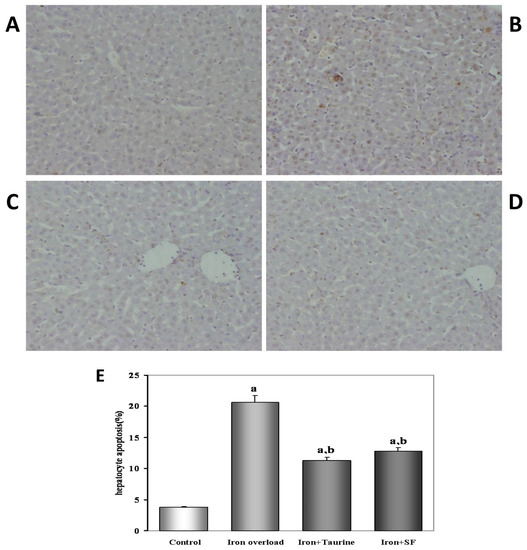 Ferrocene supplement in the diet significantly promoted hepatocyte apoptosis when compared to the control group, as indicated by a significant increase in the TUNEL-positive hepatocytes. Surprisingly, both TAU and SF treatment showed a significant decrease in the TUNEL-positive hepatocytes when compared to the iron-overload group (both at p < 0.01) (Figure 1). Thus, both TAU and SF prevent hepatocyte apoptosis associated with iron-overload conditions.
