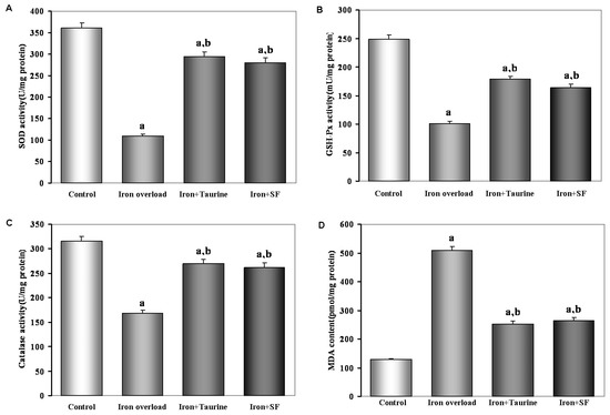 Iron-catalyzed oxidative damage to the liver is presumed to be the major causal factor in the impairment of hepatic function [23,24]. Therefore, we speculated that the mechanisms by which TAU and SF prevent iron overload-induced liver damage can be attributed to inhibition of oxidant stress. In the present study, both TAU and SF prevented the excessive ROS generation in iron-overloaded mice. Antioxidant compounds are capable of neutralizing ROS and counteract the harmful effects of ROS [25,26,27]. In this study, antioxidant measurements were performed in all four groups. Statistically significant differences were found for all antioxidant measurements (SOD, GSH-Px, Catalase activities and GSH, GSSH levels in hepatic tissue, and MDA level in hepatic tissue) between the four groups. In the iron-overload group, SOD, GSH-Px, Catalase and GSH values were lower than in the control group. Moreover, except for MDA, antioxidant measurement values were higher than in the iron-overload group. MDA was a typical biomarker used in the evaluation of injury due to lipid peroxidation, which represented the most frequent injury resulting from the activation of ROS [28,29]. Therefore, TAU and SF significant prevented the MDA increase associated with iron overload.
