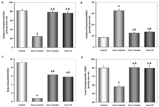 The effect of TAU or SF on hepatic GSH (A) and GSSG (B) levels, the ratio of GSH/GSSG (C) and the total amount GSH + GSSG (D) in iron-overloaded mice. Data represents mean ± SE of 12 independent experiments. a: p < 0.01, vs. control group; b: p < 0.01, vs. iron overload group.
