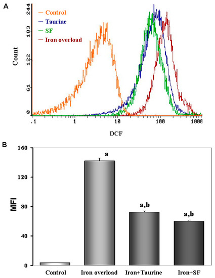 The effect of TAU or SF on hepatic intercellular ROS generation in iron-overloaded mice. (A) Cellular ROS contents were measured by flow cytometry. The incubation methods of every group were the same as we described in the Materials and Methods. Hepatocytes were then cultured for 20 min in the dark. All cells harvested for DCFH-DA incubating and measured using flow cytometry system; (B) Quantitative analysis of mean fluorescence intensity (MFI) of DCF. Data represents mean ± SE of 12 independent experiments. a: p < 0.01, vs. control group; b: p < 0.01, vs. iron overload group.