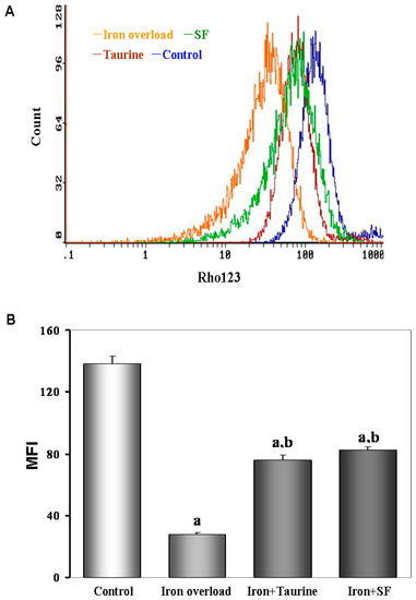 The effects of TAU or SF on mitochondrial membrane potential (MMP) in iron-overloaded mice. (A) Fluorescent indicator Rhodamine123 was used to detect the change of MMP in different gourps. The fluorescent distribution curve shifted to the left in iron overload group, indicating a reduction of MMP. However, the curve shifted to the right in the cells treated with ST or TAU; (B) Quantitative analysis of mean fluorescence intensity (MFI) of Rhodamine123. Data represents mean ± SE of 12 independent experiments. a: p < 0.01, vs. control group; b: p < 0.01, vs. iron overload group.