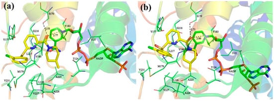 The detailed binding modes of complexes 11β-HSD1-11 (a) and 11β-HSD1-14 (b).