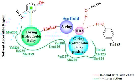 Combining the results from above docking simulations, 3D-QSAR analyses, and quantum chemistry computations, structural requirements for designing novel 11β-HSD1 inhibitors are summarized in Figure 5. A relatively conserved hydrogen bond accepter region (HBA) is essential for an inhibitor respecting the existence of residues Ser170 and Tyr183. Linker identity suggests that strict structural requirements at this position so that −SCH2− would be a suitable group. The B-ring was predicted to be surrounded by several hydrophobic residues, like Met179, Ile230, and Val231. It is consistent with the experimental activity that appropriate linker between A-ring and B-ring would also make the distal aromatic ring deep into this sub-region to interact with these hydrophobic residues. In addition, a moderately bulky group substituted on the 5′/6′-position of B-ring would increase the activity for the sake of the existence of Met233. Moreover, since the B-ring extends to a relatively capacious region at the surface of the protein, modification at specific position of B-ring may improve the physicochemical property of an inhibitor without sacrificing the potency. The bulky and hydrophobic group with positive charges potential of the C-ring are also predicted to be acceptable for the inhibitors. Thus, proper substitutions at these regions could directly contribute to improving the bioactivities of 11β-HSD1 inhibitors.