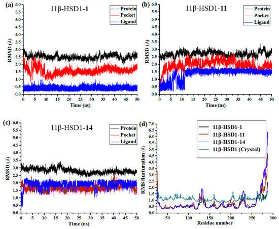 RMSDs of backbone atoms (C, Cα, and N) of the protein, backbone atoms of residues in the binding pocket (within 5 Å around each inhibitor), and the heavy atoms in the ligand for (a) 11β-HSD1-1; (b) 11β-HSD1-11; (c) 11β-HSD1-14; (d) RMSF of each residue of protein for all three complexes obtained from 50 ns MD simulations and crystal structure.