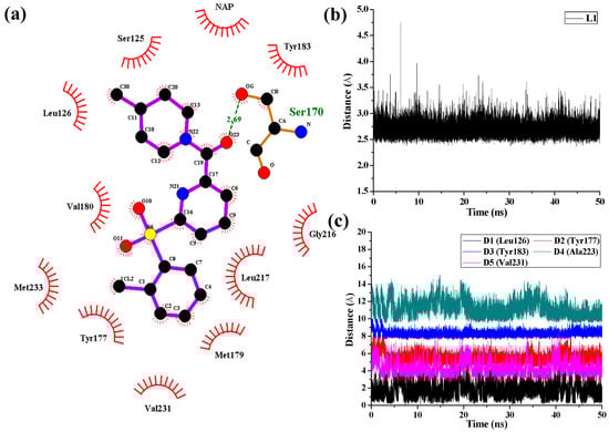 (a) H-bonds and hydrophobic interactions between 11β-HSD1 and compound 14 generated by LIGPLOT program; (b) H-bond interaction of 14 in the binding site with time evolution. L1 represents the distances between the amide carbonyl oxygen and the side chain hydroxyl of Ser170. (c) Mass-center distances associated with hydrophobic interactions between 11β-HSD1 and 14 in the binding site over 50 ns of MD trajectories. The curve of D1 is shifted downward by 3.0 Å. D2, D3, and D4 are shifted upward by 1.0 Å, 4.5 Å, and 6.0 Å, respectively.