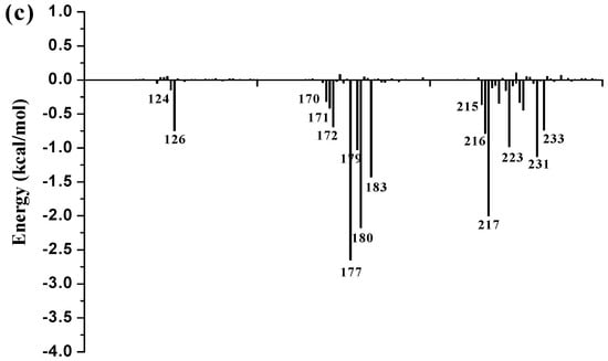 Per-residue binding free energy decomposition of: (a) 11β-HSD1-1; (b) 11β-HSD1-11; (c) 11β-HSD1-14.