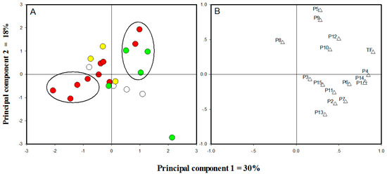 Principal component analysis of O. fragrans cultivars based on PC1 and PC2 scores. (A) Score plot of cases: white dots denote cultivars from Albus Group, yellow dots denote cultivars from Luteus Group, red dots denote cultivars from Aurantiacus Group, and green dots denote cultivars from Asiaticus Group; (B) Score plot of variables: triangles denote components from O. fragrans leaves, for which numbers are the same as in Figure 1.