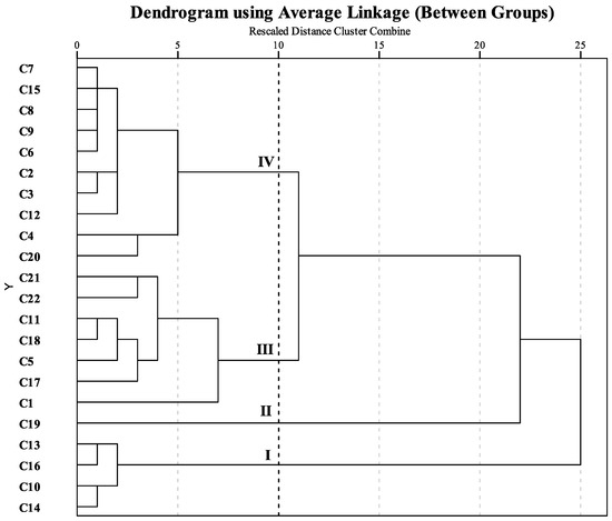 In addition, hierarchical cluster analysis (HCA) was performed to obtain a specific classification of the 22 cultivars on the basis of 15 components and total flavonoids. Differences between samples are represented by Euclidean distances. Figure 4 shows a dendrogram of hierarchical cluster analysis of the 22 samples using the between-group linkage method. The abscissa expresses Euclidean distances, whereas the ordinate indicates sample numbers. As a result, which was similar to that of the PCA analysis, the samples were divided into four clusters when the Euclidean distances of the dendrogram was 10. Cluster I incorporated C13, C16, C10, and C14 which belonged to the Aurantiacus Group. Only C19 was separated as cluster II. Cluster III contained C1 of the Albus Group, C5 of the Luteus Group, C11 and C17 of the Aurantiacus Group, and C18, C21, and C22 of the Asiaticus Group. Cluster IV contained C2, C3, C4 of the Albus Group, C6 and C7 of the Luteus Group, C8, C9, C12, and C15 of the Aurantiacus Group, and C20 of the Asiaticus Group.