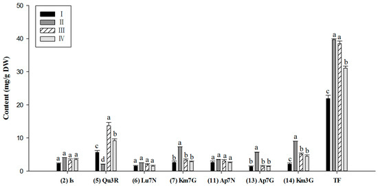 Based on the analysis of variance for the major flavonoid components and total flavonoids of these four clusters, the levels could be distinguished (Figure 5). Significant differences in quercetin 3-O-rutinose (5), kaempferol 7-O-glucoside (7), kaempferol 3-O-glucoside (14), apigenin 7-O-glucoside (13), and total flavonoid contents were found, whereas the contents of isorhamnetin derivative (2), luteolin 7-O-neohesperidoside (6), and apigenin 7-O-neohesperidoside (11) were similar in the different clusters. Cluster I contained the lowest concentration of total flavonoids (21.90 ± 1.02 mg/g, DW), and the levels of dominant components were also lower than in other clusters. Conversely, the leaves of cluster III cultivars accumulated the highest levels of rutin (13.79 ± 0.98 mg/g, DW) and total flavonoids (38.50 ± 0.80 mg/g, DW). Of note, the leaf sample of cluster II cultivar was characterized by a relatively higher content of kaempferol glycosides, apigenin 7-O-glucoside and total flavonoids, whereas the quercetin 3-O-rutinose (5) level was significantly lower than in other clusters. The remaining cultivars were grouped as the fourth cluster, which contained moderate level of total flavonoids.