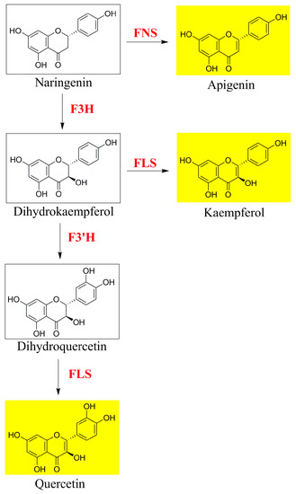 Local diagram of the flavonoid biosynthetic pathway. FNS: flavone synthase; F3H: flavanone 3-hydroxylase; FLS: flavonol synthase; and F3′H: flavonoid 3′-hydroxylase