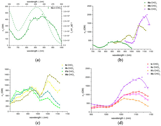 (a) 1PA (dashed line) and 2PA (colored points and solid line) spectra measured for the chromophore IIIa in CHCl3; (b) Comparison between two-photon absorption spectra for the dyes IIIa–c in CHCl3; (c) Comparison between the 2PA spectra of derivatives I–IIIb in CHCl3; (d) Comparison between the 2PA spectra of derivatives I–IIIc in CHCl3.